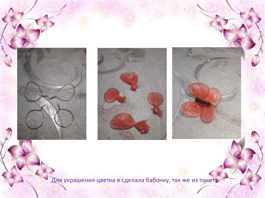 Для украшения цветка я сделала бабочку, так же из пакета10.