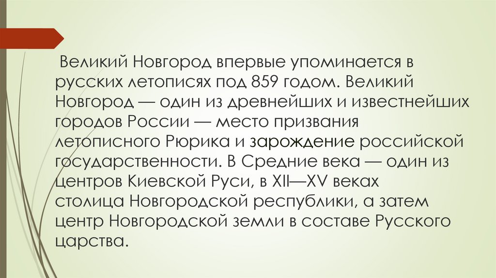 Великий Новгород впервые упоминается врусских летописях под 859 годом. Великий