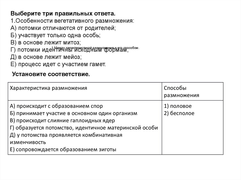 Выберите три правильных ответа.1.Особенности вегетативного размножения: