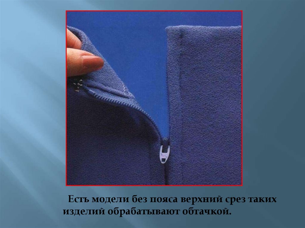 Есть модели без пояса верхний срез такихизделий обрабатывают обтачкой.