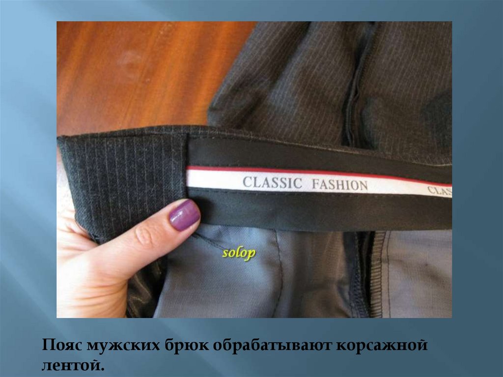 Пояс мужских брюк обрабатывают корсажнойлентой.