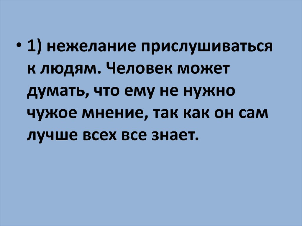 • 1) нежелание прислушиватьсяк людям. Человек может
