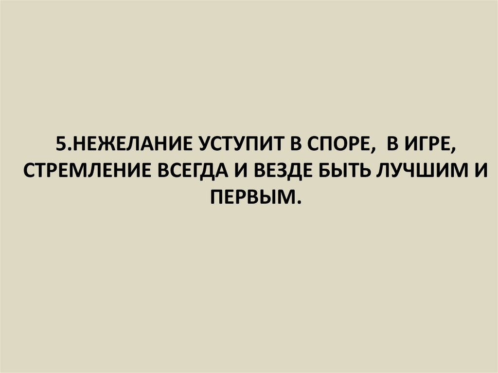 5.НЕЖЕЛАНИЕ УСТУПИТ В СПОРЕ, В ИГРЕ,СТРЕМЛЕНИЕ ВСЕГДА И ВЕЗДЕ БЫТЬ ЛУЧШИМ И