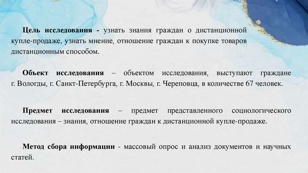 Цель исследования - узнать знания граждан о дистанционнойкупле-продаже, узнать мнение, отношение граждан к покупке товаров