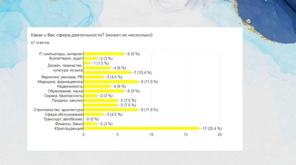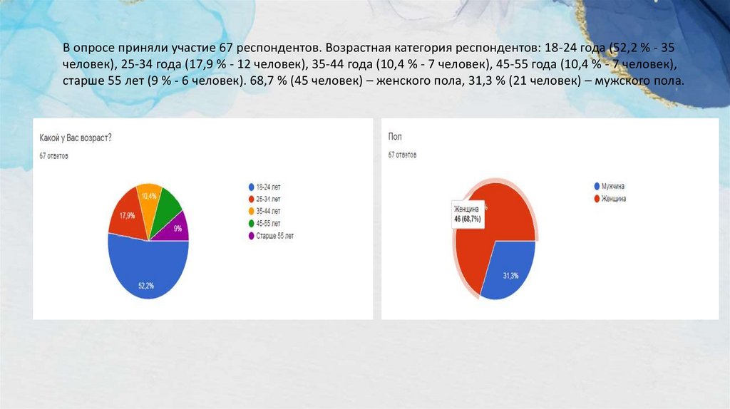 В опросе приняли участие 67 респондентов. Возрастная категория респондентов: 18-24 года (52,2 % - 35человек), 25-34 года (17,9 % - 12 человек), 35-44 года (10,4 % - 7 человек), 45-55 года (10,4 % - 7 человек),