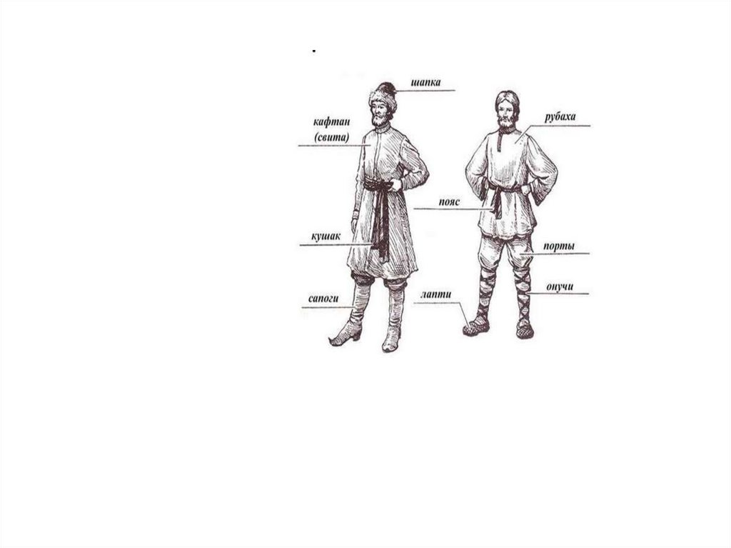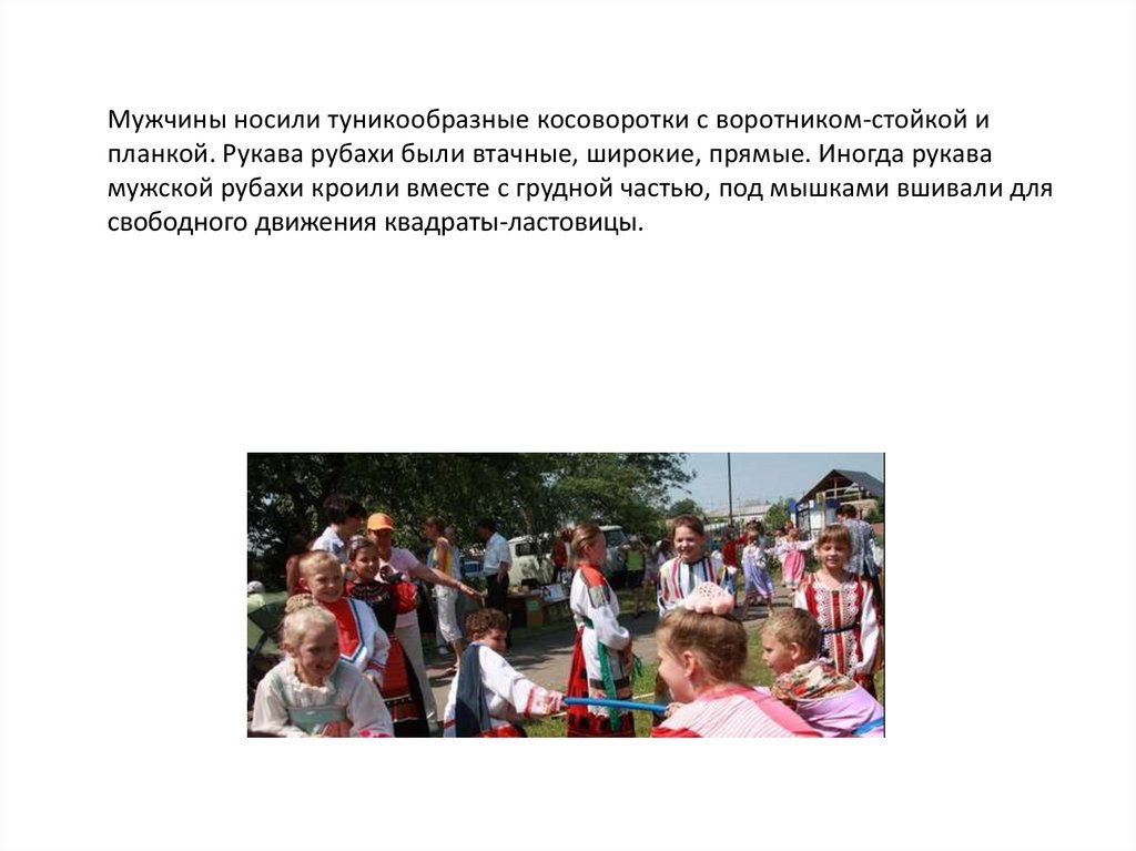 Мужчины носили туникообразные косоворотки с воротником-стойкой ипланкой. Рукава рубахи были втачные, широкие, прямые. Иногда рукава