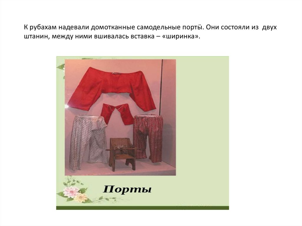 К рубахам надевали домотканные самодельные портӹ. Они состояли из двухштанин, между ними вшивалась вставка – «ширинка».