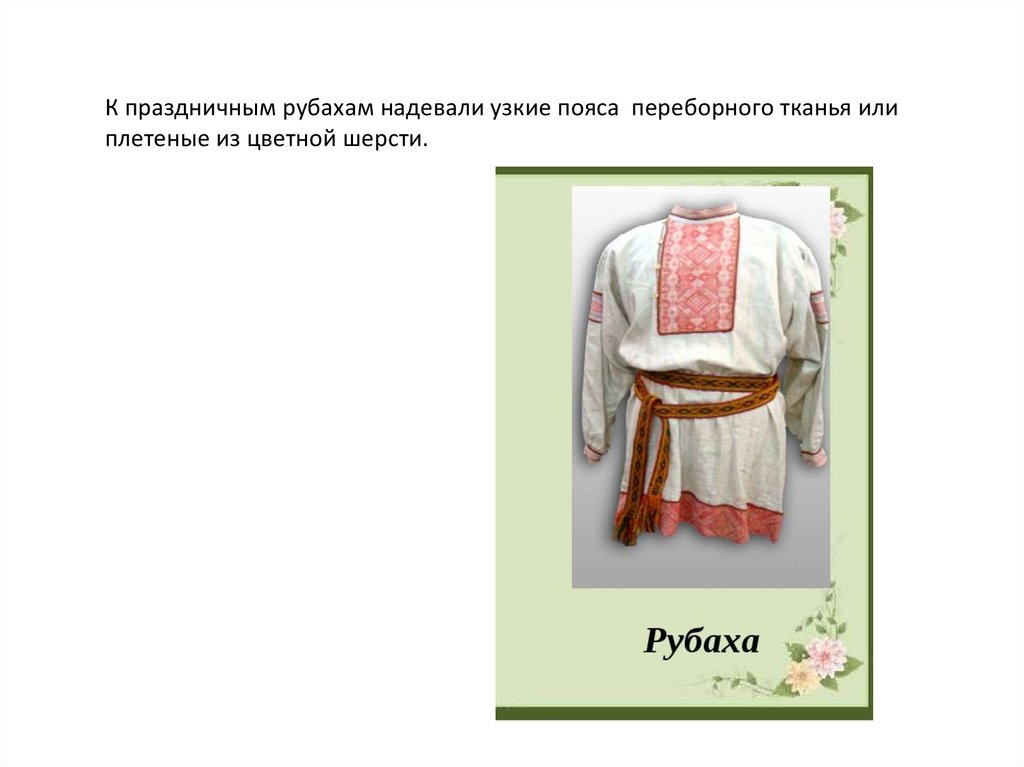 К праздничным рубахам надевали узкие пояса переборного тканья илиплетеные из цветной шерсти.