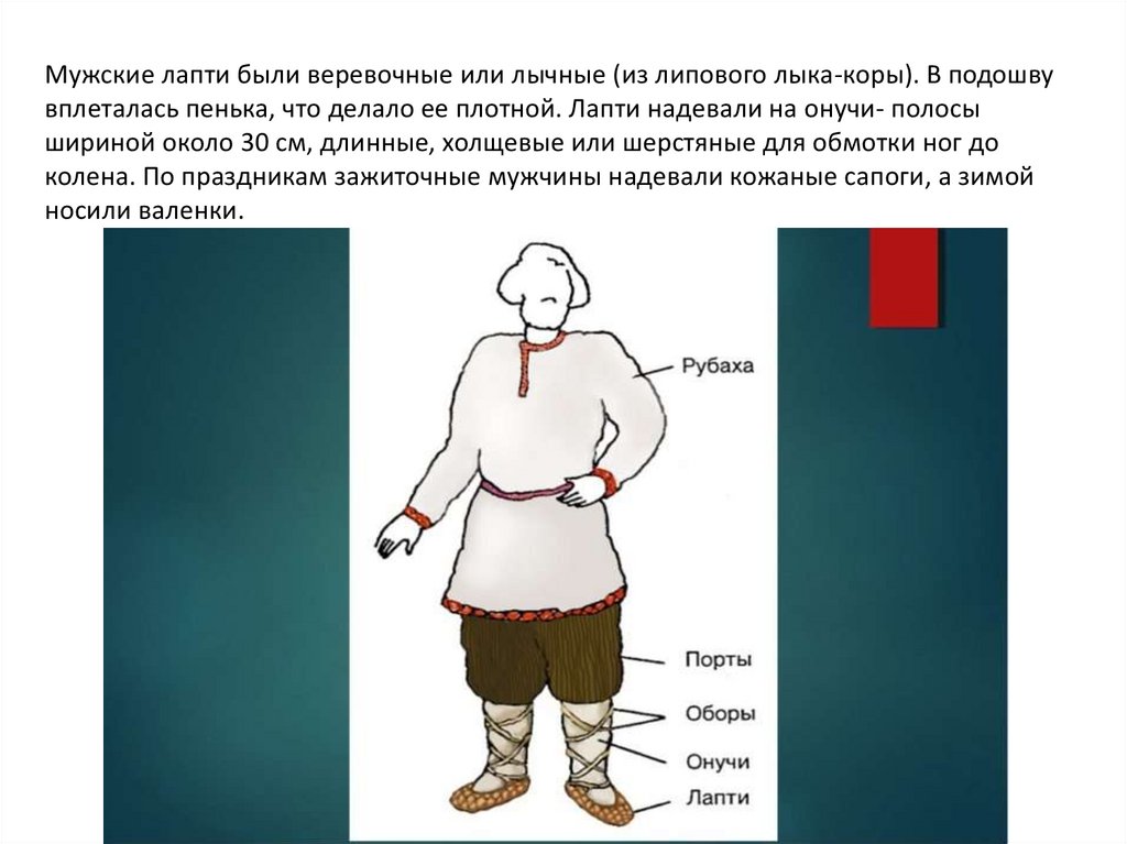 Мужские лапти были веревочные или лычные (из липового лыка-коры). В подошвувплеталась пенька, что делало ее плотной. Лапти надевали на онучи- полосы