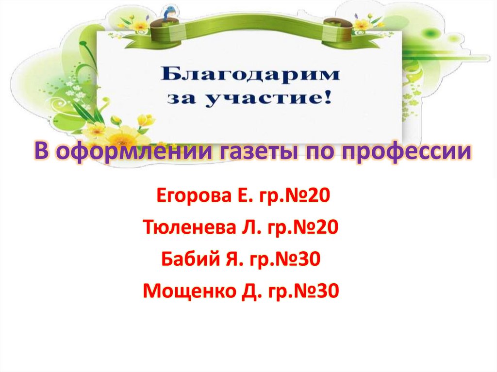 В оформлении газеты по профессииЕгорова Е. гр.№20