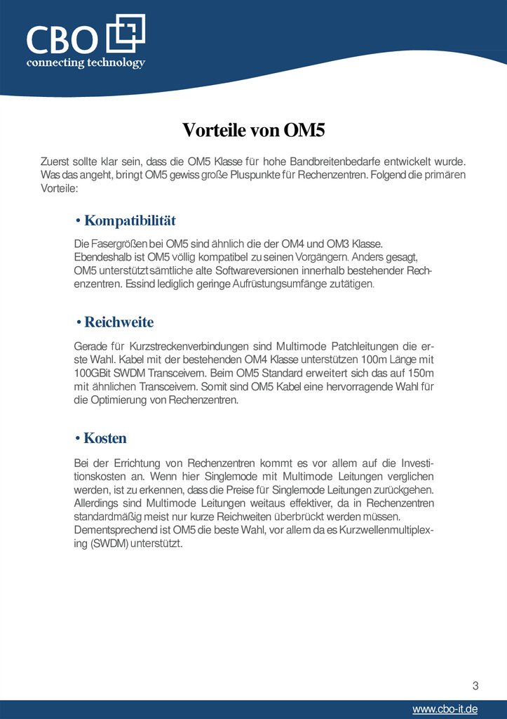 Vorteile von OM5Zuerst sollte klar sein, dass die OM5 Klasse für hohe Bandbreitenbedarfe entwickelt wurde.