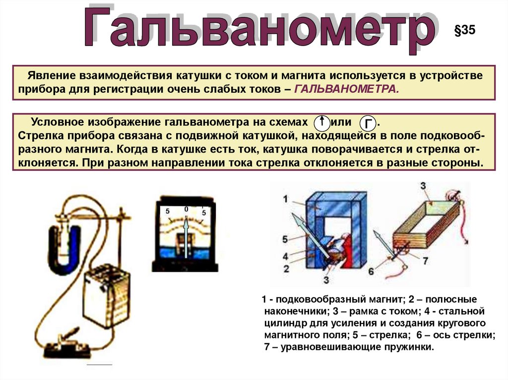 прибора для регистрации очень слабых токов – ГАЛЬВАНОМЕТРА.
