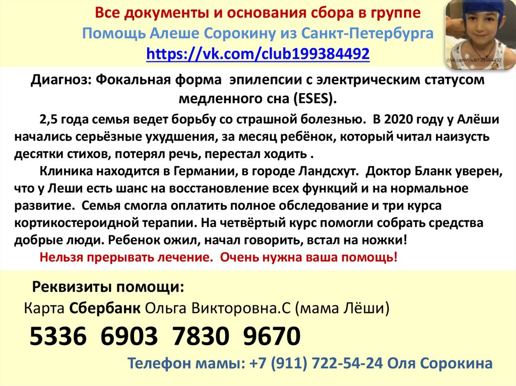 Все документы и основания сбора в группеПомощь Алеше Сорокину из Санкт-Петербурга