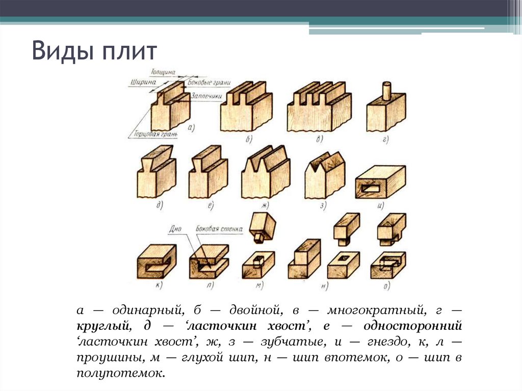 ‘ласточкин хвост’, ж, з — зубчатые, и — гнездо, к, л —