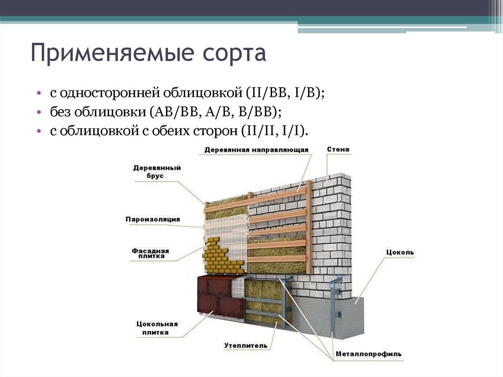 Применяемые сорта• с односторонней облицовкой (II/BB, I/B);
