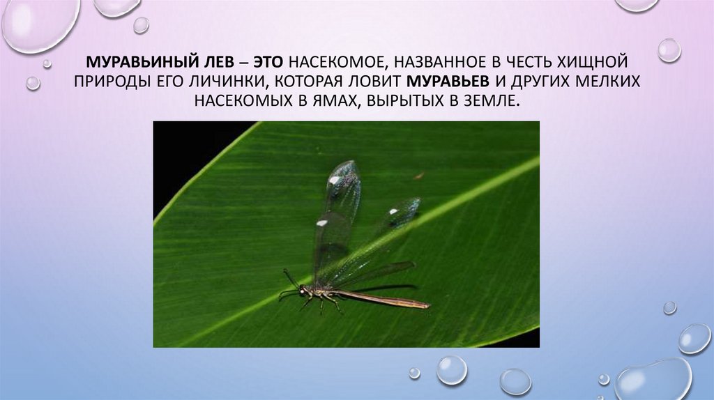 МУРАВЬИНЫЙ ЛЕВ – ЭТО НАСЕКОМОЕ, НАЗВАННОЕ В ЧЕСТЬ ХИЩНОЙПРИРОДЫ ЕГО ЛИЧИНКИ, КОТОРАЯ ЛОВИТ МУРАВЬЕВ И ДРУГИХ МЕЛКИХ