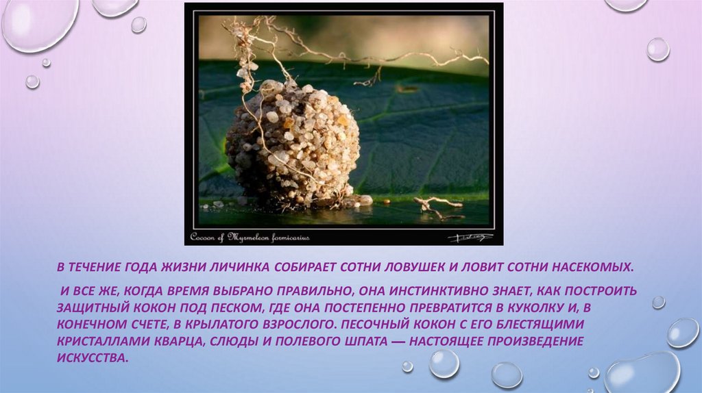 В ТЕЧЕНИЕ ГОДА ЖИЗНИ ЛИЧИНКА СОБИРАЕТ СОТНИ ЛОВУШЕК И ЛОВИТ СОТНИ НАСЕКОМЫХ.И ВСЕ ЖЕ, КОГДА ВРЕМЯ ВЫБРАНО ПРАВИЛЬНО, ОНА ИНСТИНКТИВНО ЗНАЕТ, КАК ПОСТРОИТЬ
