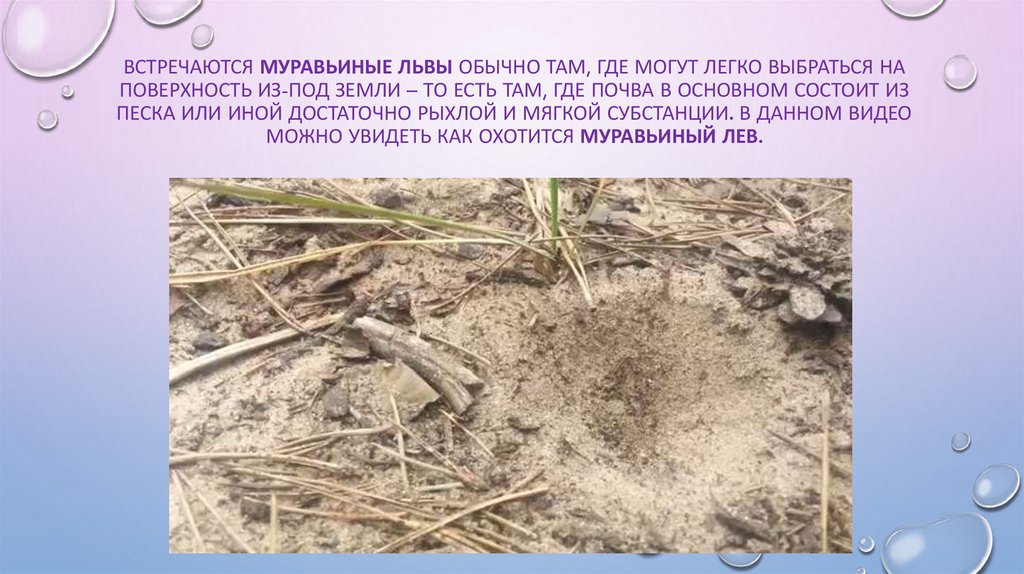 ВСТРЕЧАЮТСЯ МУРАВЬИНЫЕ ЛЬВЫ ОБЫЧНО ТАМ, ГДЕ МОГУТ ЛЕГКО ВЫБРАТЬСЯ НАПОВЕРХНОСТЬ ИЗ-ПОД ЗЕМЛИ – ТО ЕСТЬ ТАМ, ГДЕ ПОЧВА В ОСНОВНОМ СОСТОИТ ИЗ