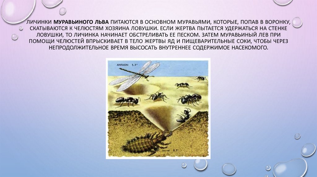 ЛОВУШКИ, ТО ЛИЧИНКА НАЧИНАЕТ ОБСТРЕЛИВАТЬ ЕЕ ПЕСКОМ. ЗАТЕМ МУРАВЬИНЫЙ ЛЕВ ПРИ