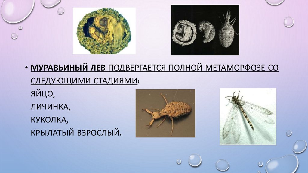 • МУРАВЬИНЫЙ ЛЕВ ПОДВЕРГАЕТСЯ ПОЛНОЙ МЕТАМОРФОЗЕ СОСЛЕДУЮЩИМИ СТАДИЯМИ: