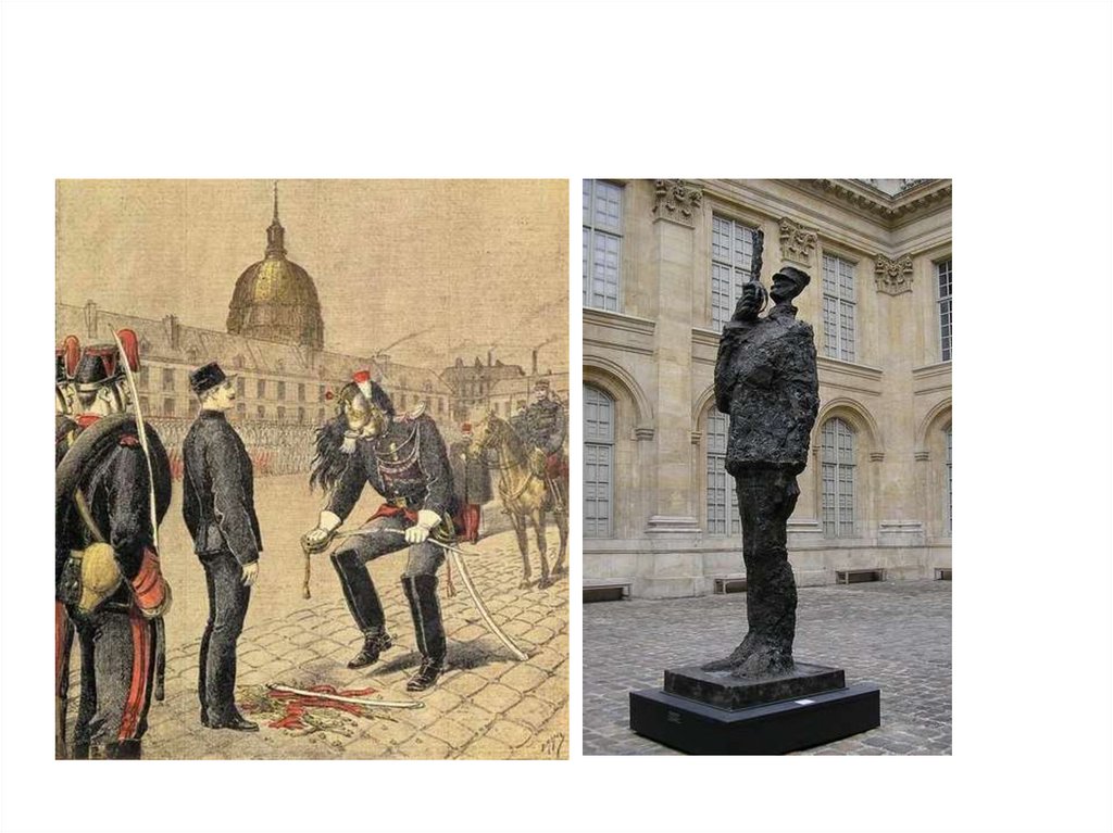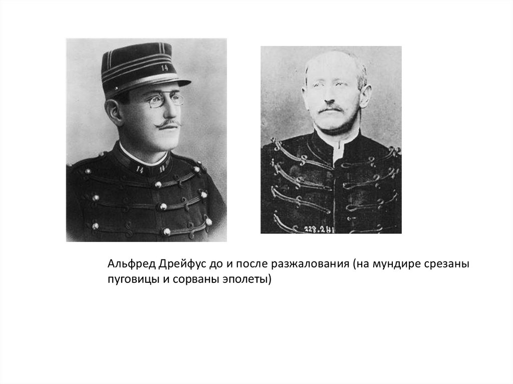 Альфред Дрейфус до и после разжалования (на мундире срезаныпуговицы и сорваны эполеты)