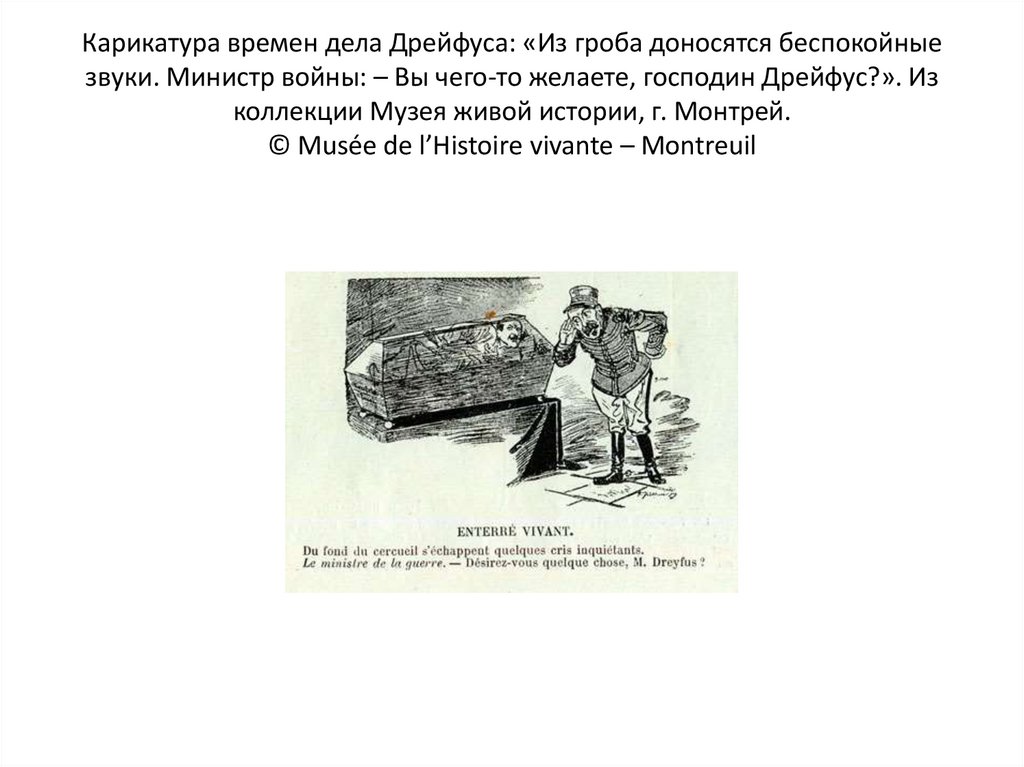 Карикатура времен дела Дрейфуса: «Из гроба доносятся беспокойныезвуки. Министр войны: – Вы чего-то желаете, господин Дрейфус?». Из
