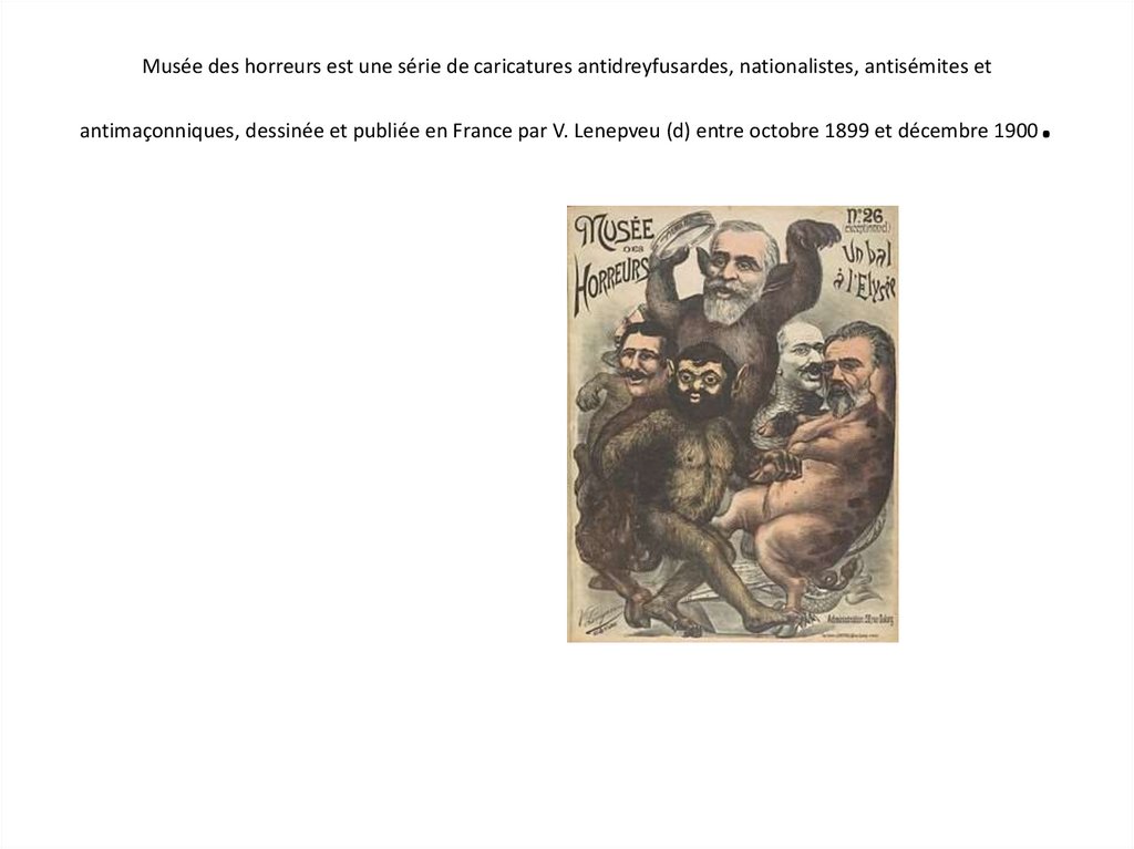 Musée des horreurs est une série de caricatures antidreyfusardes, nationalistes, antisémites etantimaçonniques, dessinée et publiée en France par V. Lenepveu (d) entre octobre 1899 et décembre 1900