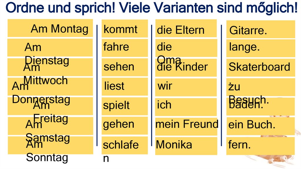 Ordne und sprich! Viele Varianten sind mőglich!Am Montag