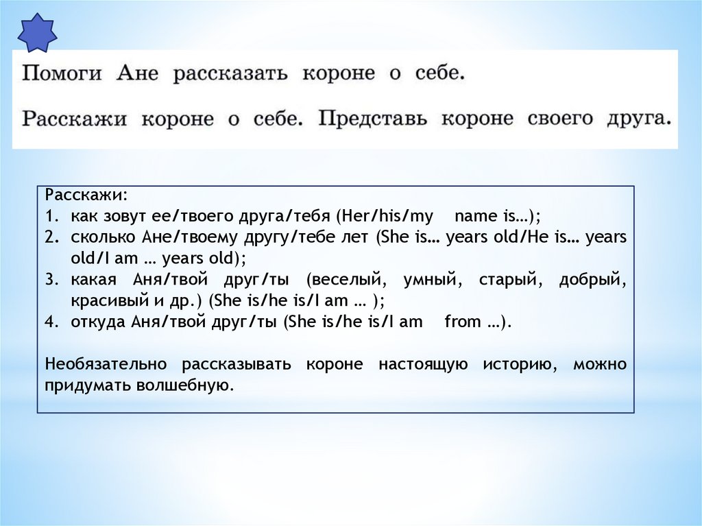 Расскажи:1. как зовут ее/твоего друга/тебя (Her/his/my name is…);