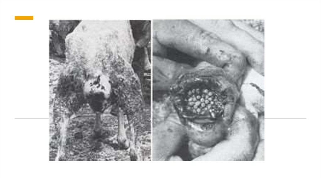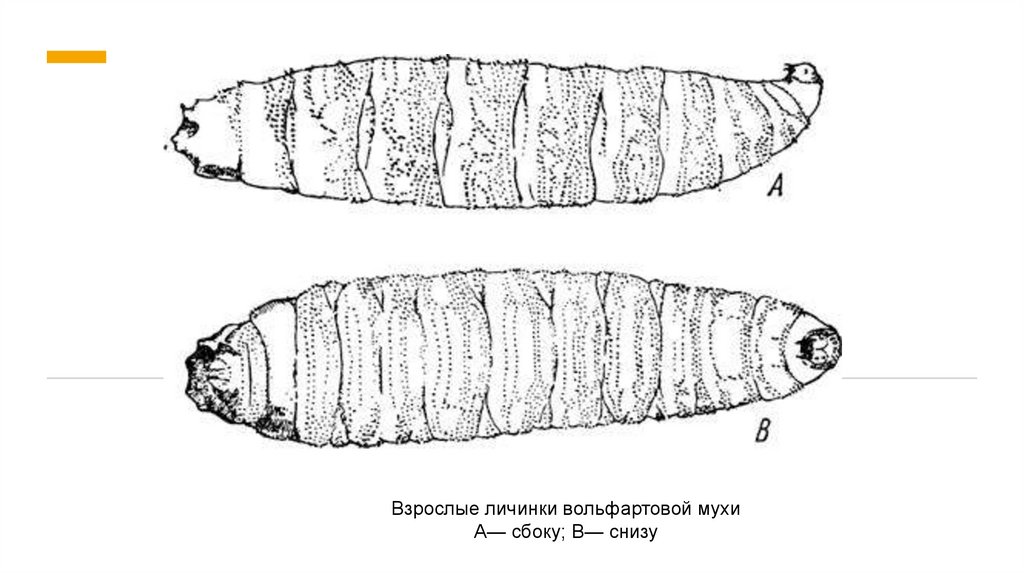 Взрослые личинки вольфартовой мухиА— сбоку; В— снизу