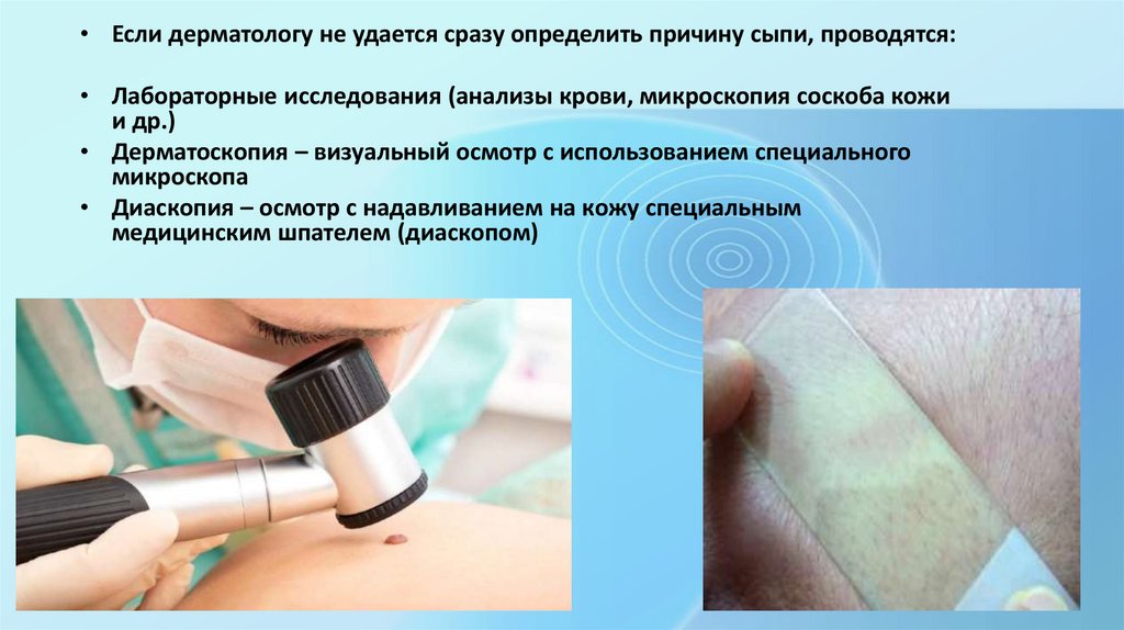 • Если дерматологу не удается сразу определить причину сыпи, проводятся:• Лабораторные исследования (анализы крови, микроскопия соскоба кожи