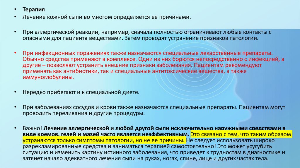 • Терапия• Лечение кожной сыпи во многом определяется ее причинами.