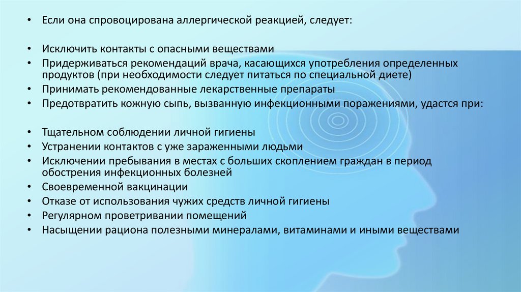• Если она спровоцирована аллергической реакцией, следует:• Исключить контакты с опасными веществами