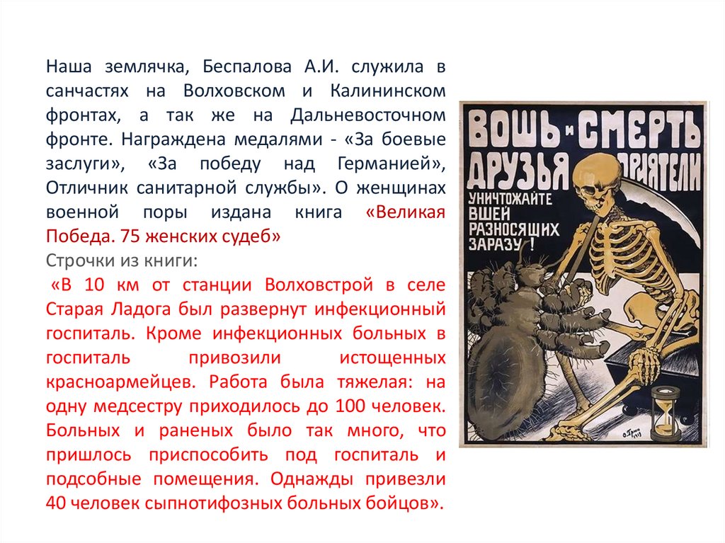 Наша землячка, Беспалова А.И. служила всанчастях на Волховском и Калининском