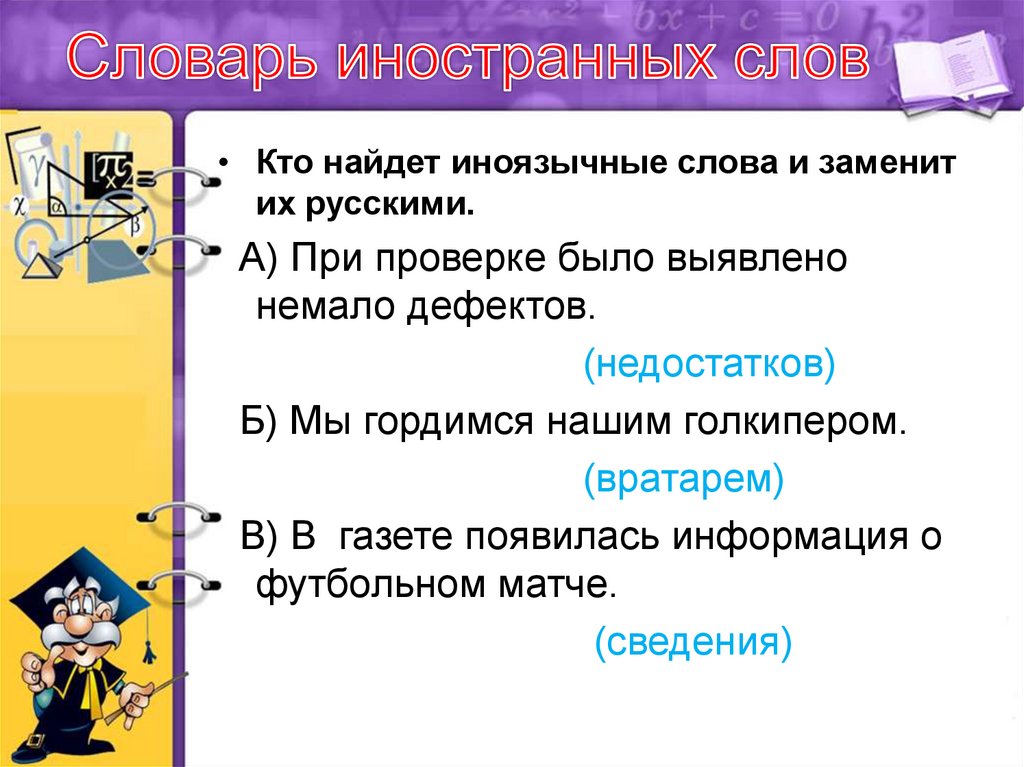 • Кто найдет иноязычные слова и заменитих русскими.
