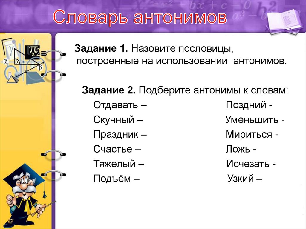 Задание 2. Подберите антонимы к словам: