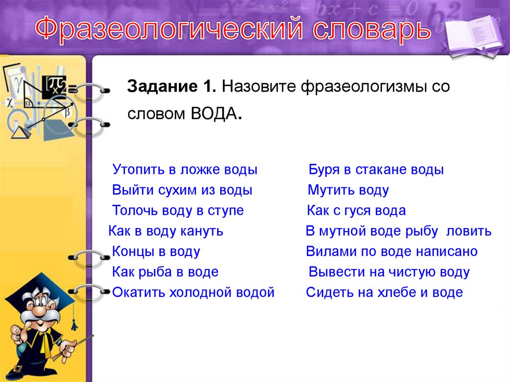 Задание 1. Назовите фразеологизмы сословом ВОДА.