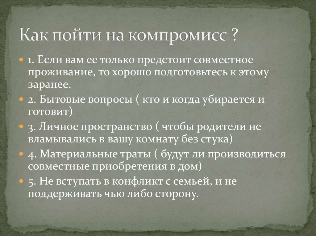 1. Если вам ее только предстоит совместноепроживание, то хорошо подготовьтесь к этому