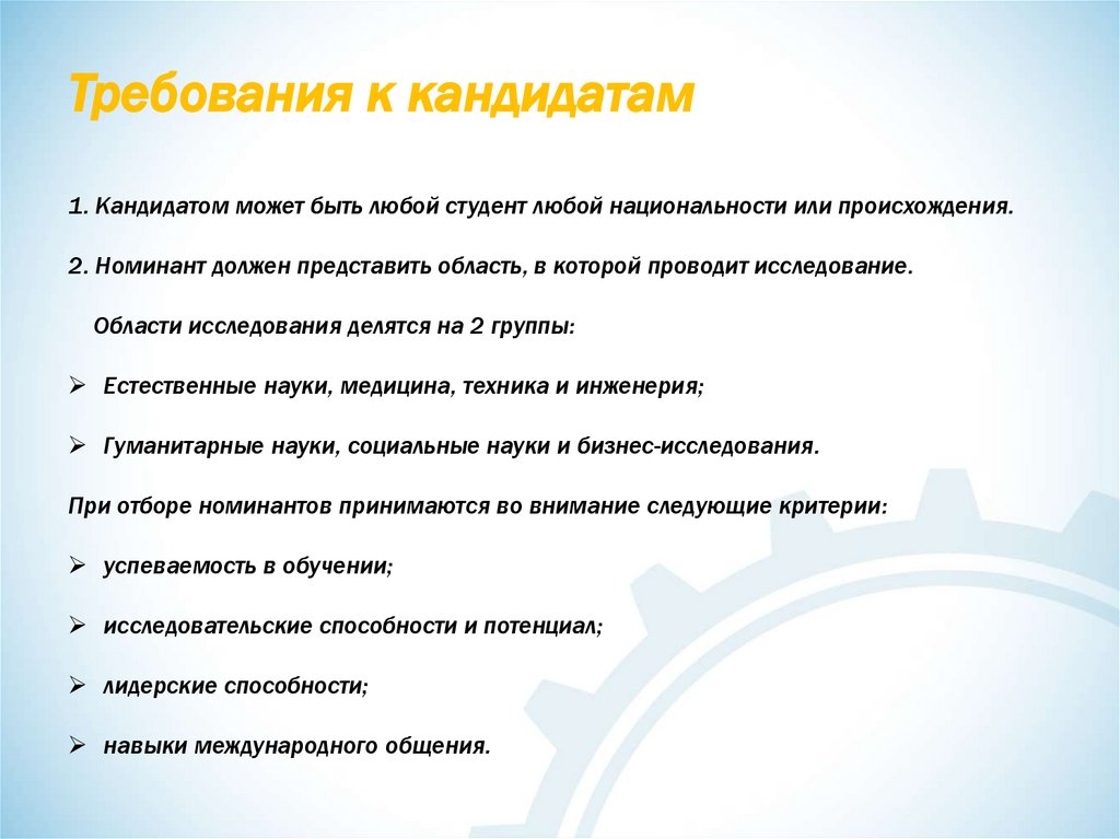 Требования к кандидатам1. Кандидатом может быть любой студент любой национальности или происхождения.