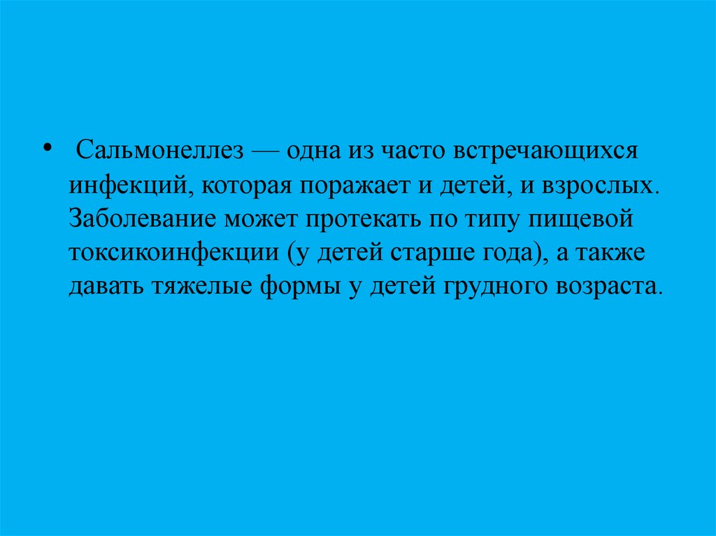• Сальмонеллез — одна из часто встречающихсяинфекций, которая поражает и детей, и взрослых.