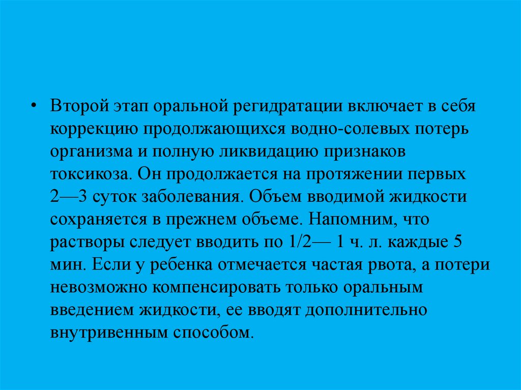 • Второй этап оральной регидратации включает в себякоррекцию продолжающихся водно-солевых потерь