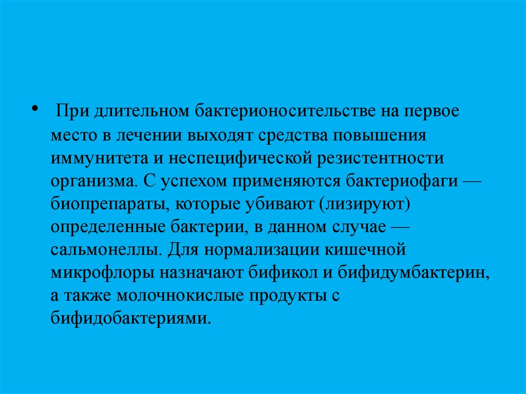 • При длительном бактерионосительстве на первоеместо в лечении выходят средства повышения