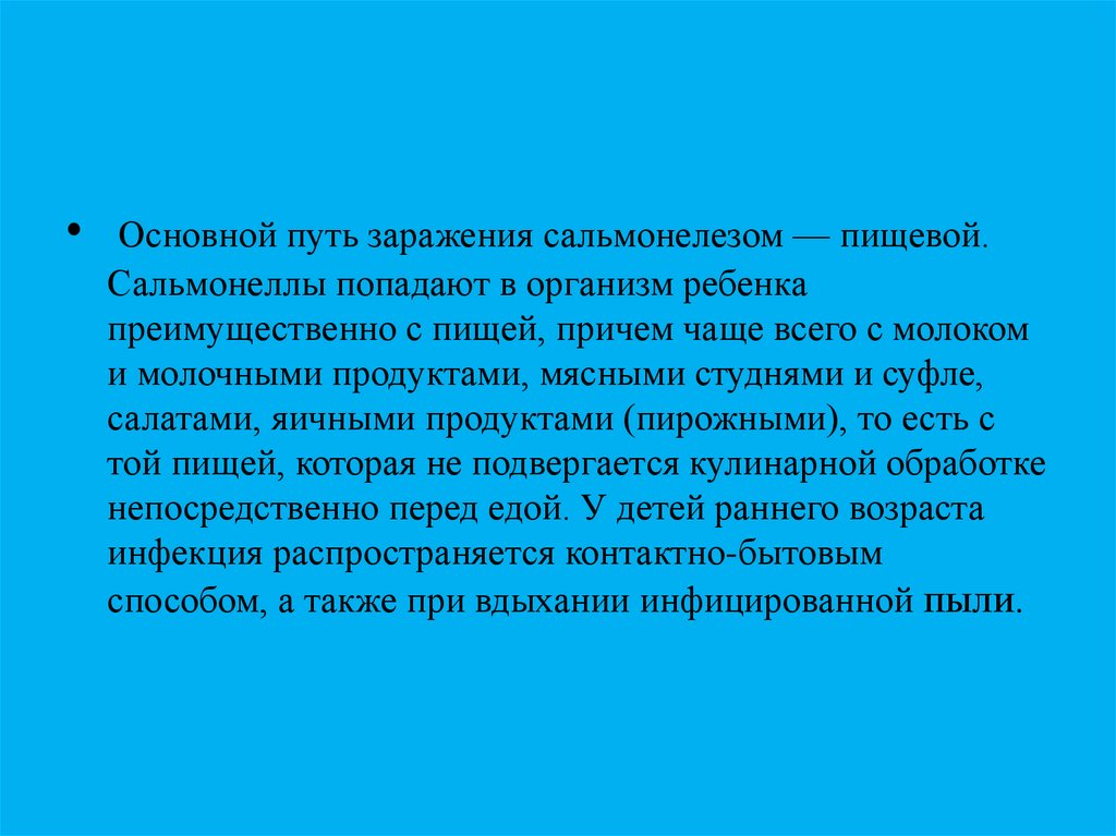 Основной путь заражения сальмонелезом — пищевой.