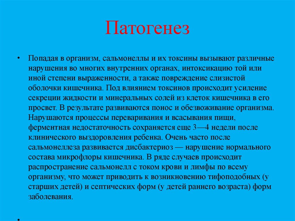Патогенез• Попадая в организм, сальмонеллы и их токсины вызывают различные