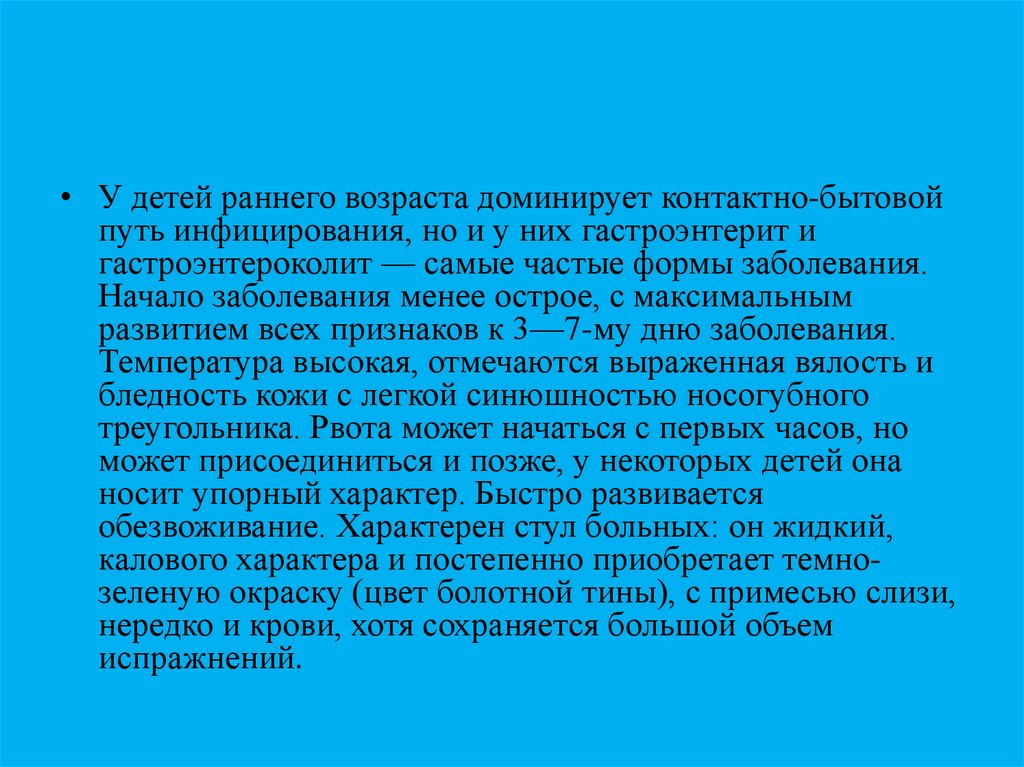 • У детей раннего возраста доминирует контактно-бытовойпуть инфицирования, но и у них гастроэнтерит и