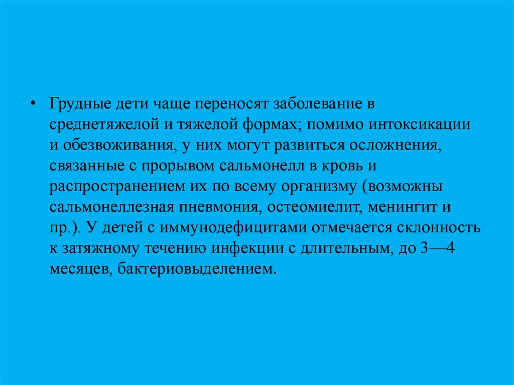 • Грудные дети чаще переносят заболевание всреднетяжелой и тяжелой формах; помимо интоксикации