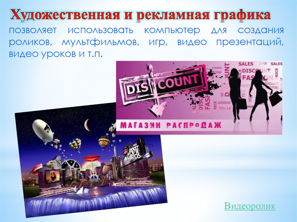 позволяет использовать компьютер для созданияроликов, мультфильмов, игр, видео презентаций,