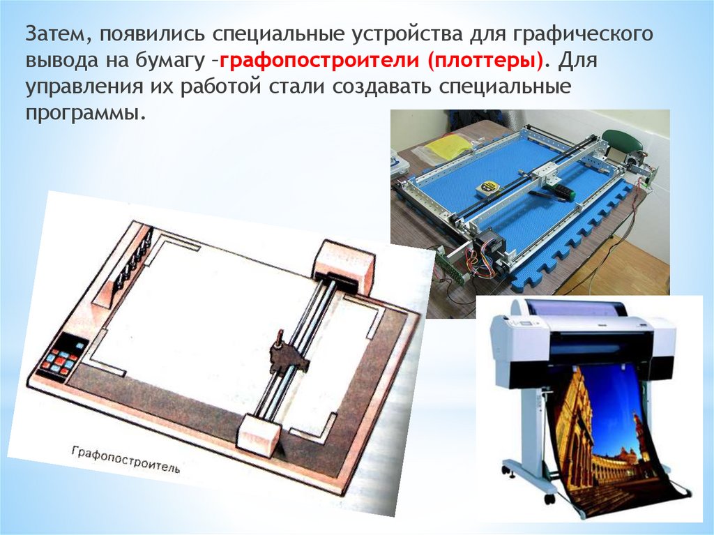 Затем, появились специальные устройства для графическоговывода на бумагу –графопостроители (плоттеры). Для