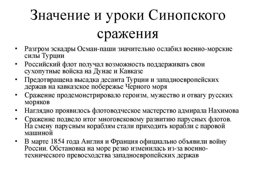 • Наглядно проявилось флотоводческое мастерство адмирала Нахимова