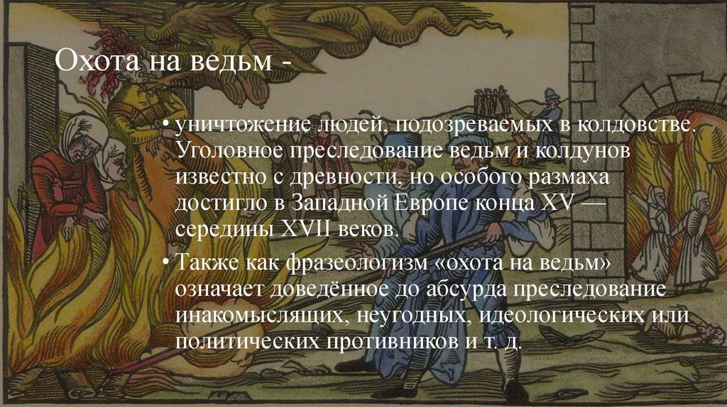 Охота на ведьм • уничтожение людей, подозреваемых в колдовстве.Уголовное преследование ведьм и колдунов